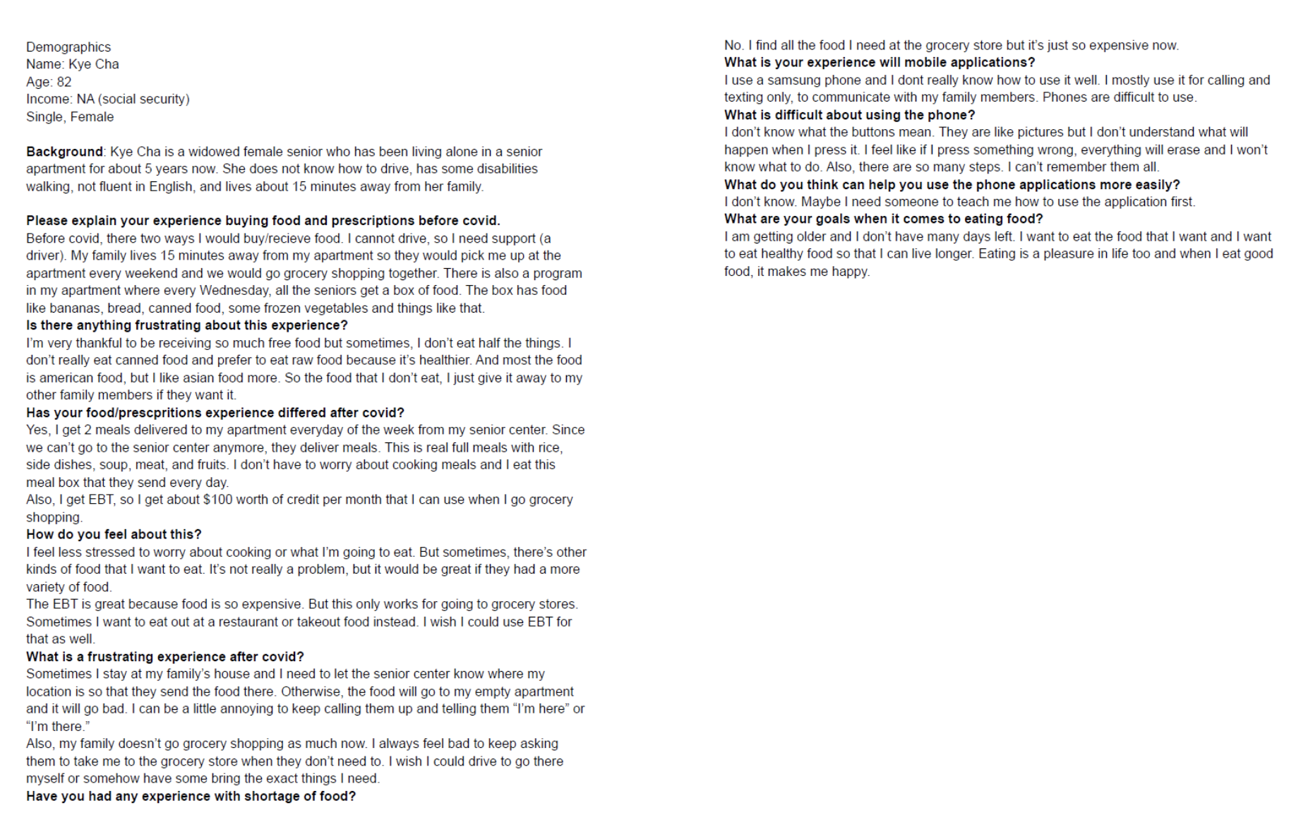 Bio: Ravi is a widowed senior who lives alone in a senior apartment. She has trouble grocery shopping alone because she cannot drive and groceries are heavy to carry. During the pandemic, the food experience has been more difficult because she is worried about exposure to the covid virus outside of her home.