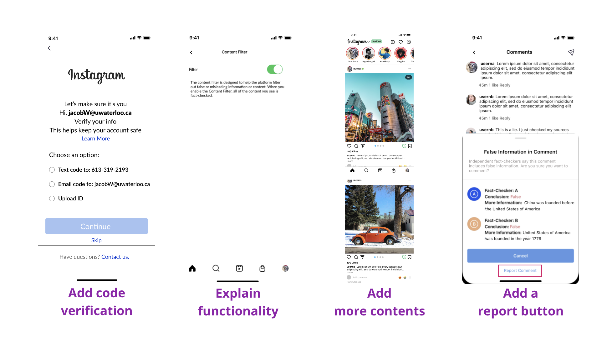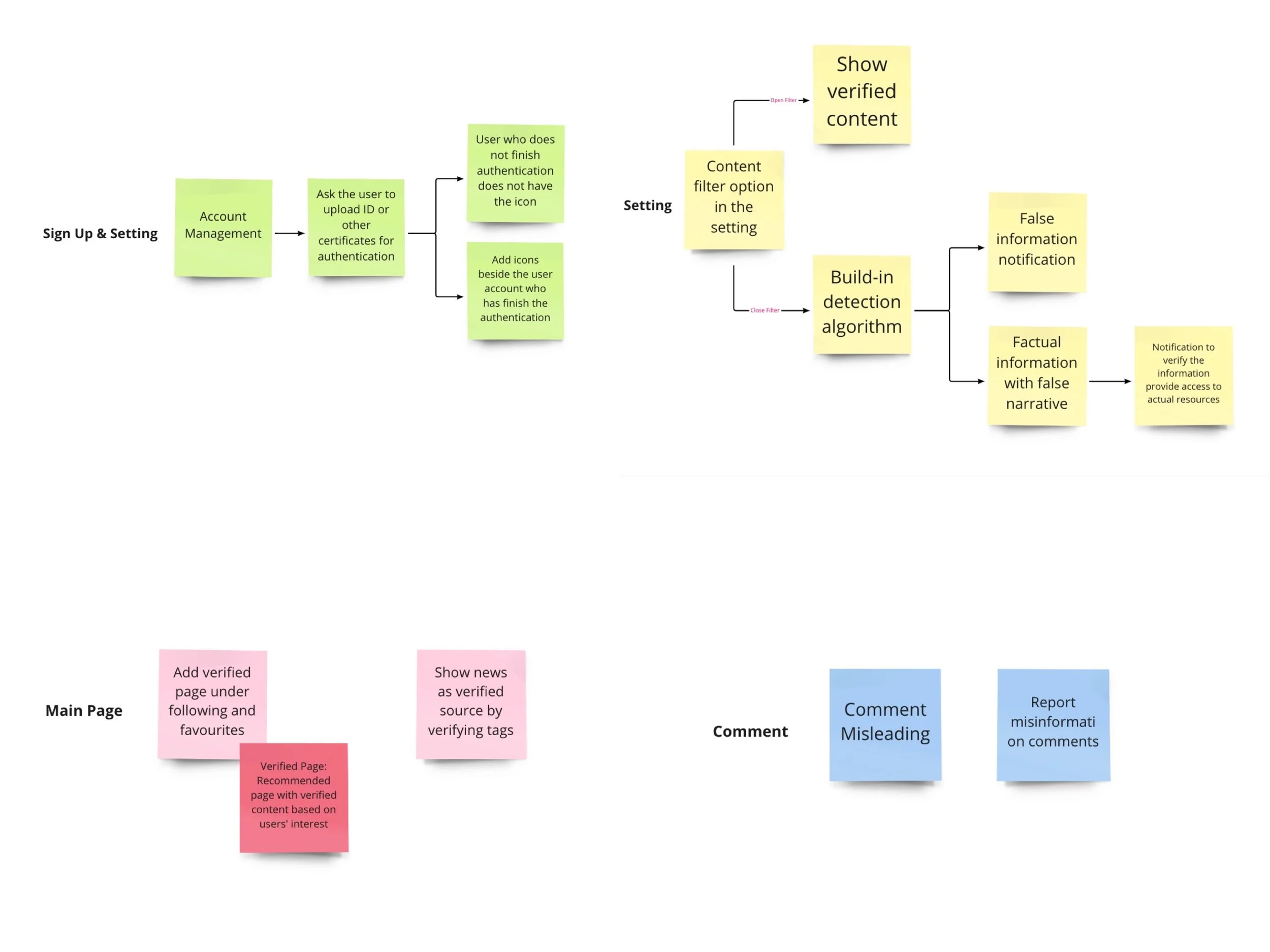 Brainstorming: Strengthening account management, Create a content filter, Create a page with all the verified posts, Misleading comments notification